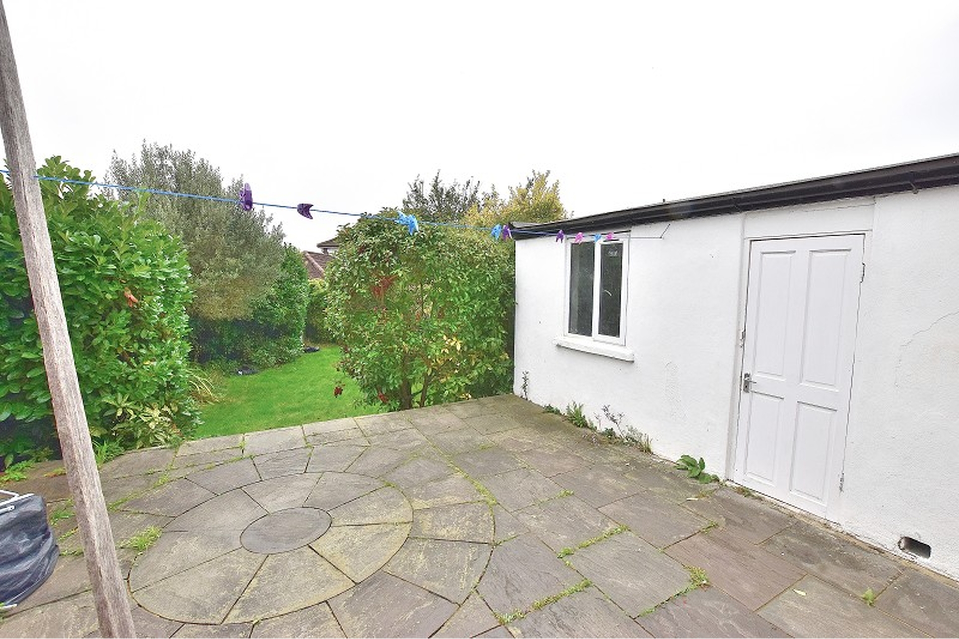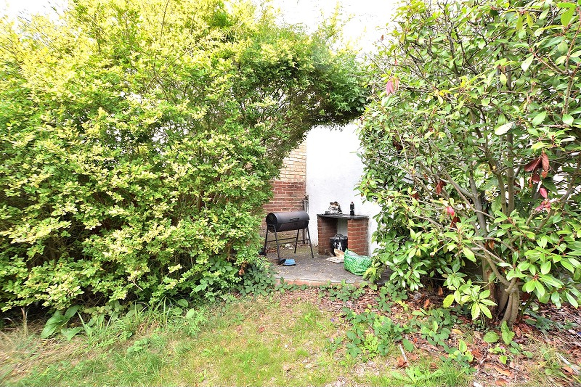 FRONT GARDEN: Off street parking, paved patio, mature boarder shrubs, side right of way leading to garage.