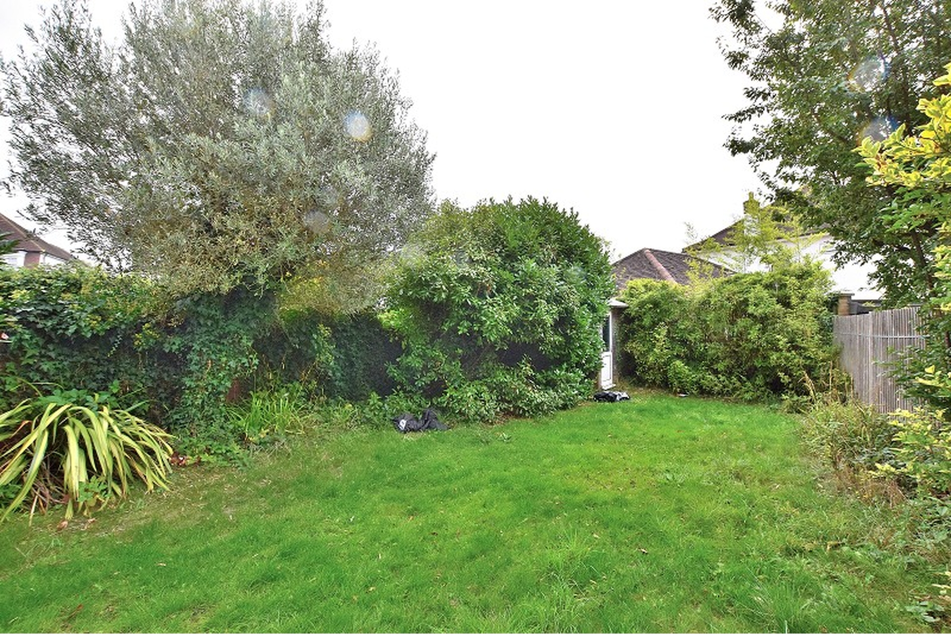 REAR GARDEN: Paved patio, steps down to lawn area, mature trees and shrubs , shed.
