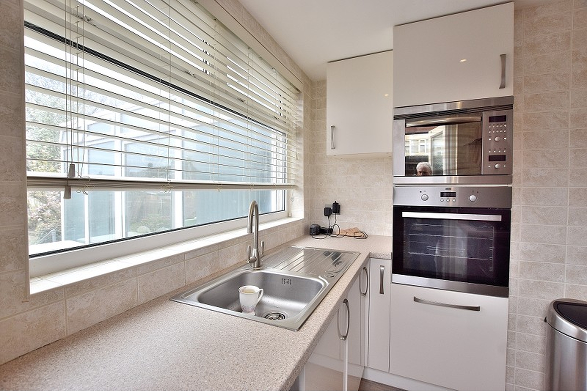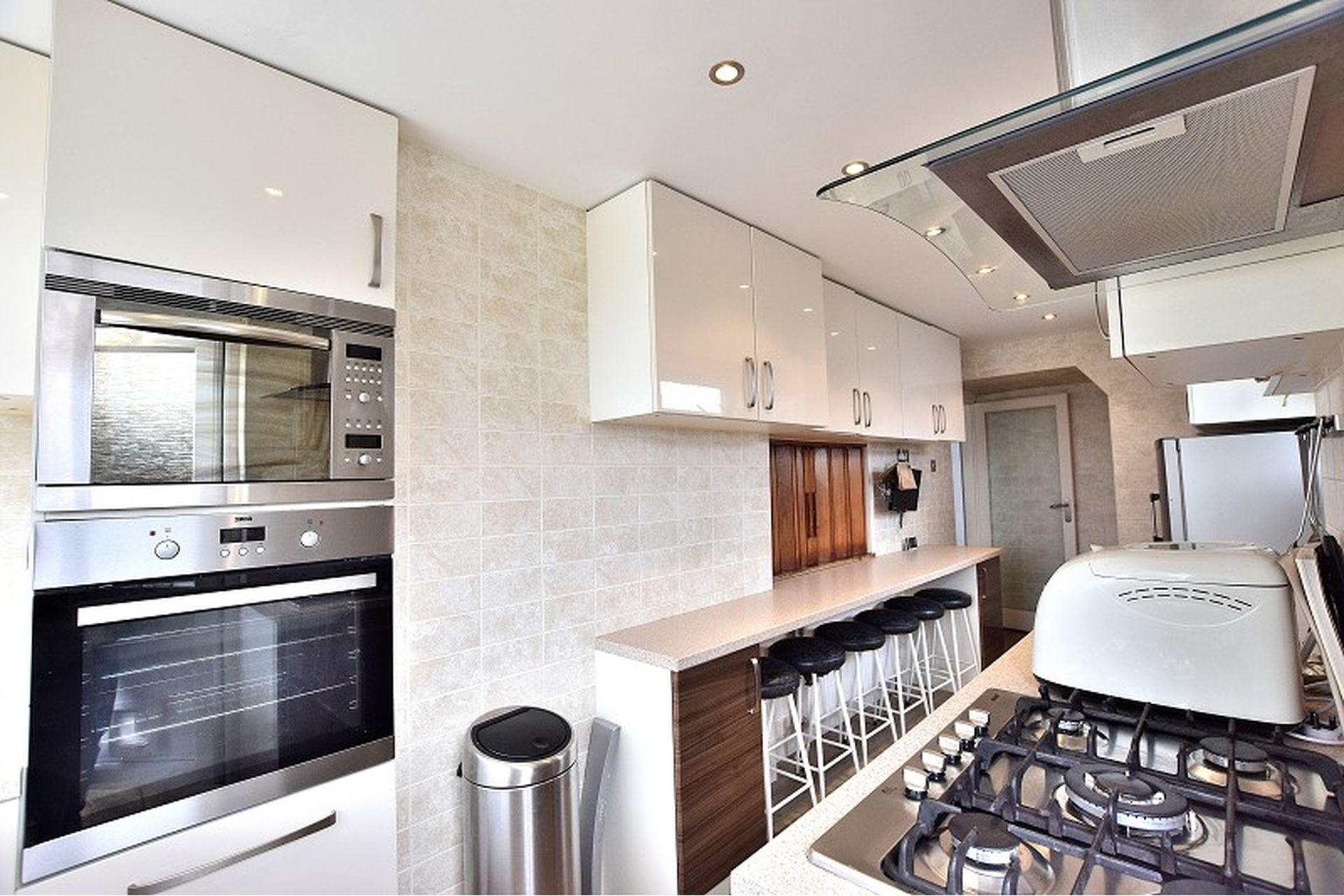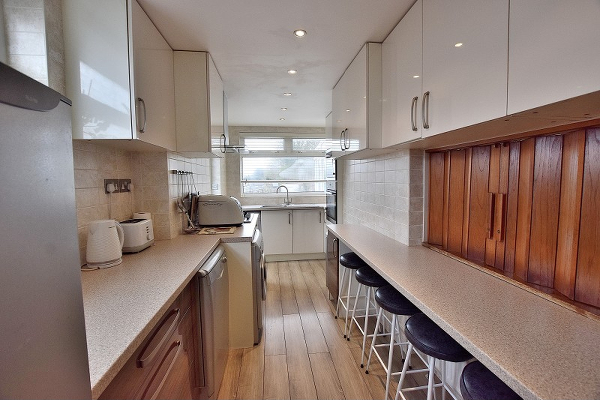 KITCHEN: Laminate flooring, fitted wall and base units, plumbing for washing machine and dishwasher, integrated 5 ring gas hob and integrated double oven, brushed steel extractor fan, fully tiled walls, UPVC double glazed window to side aspect, spotlights, cupboard housing gas boiler (untested).