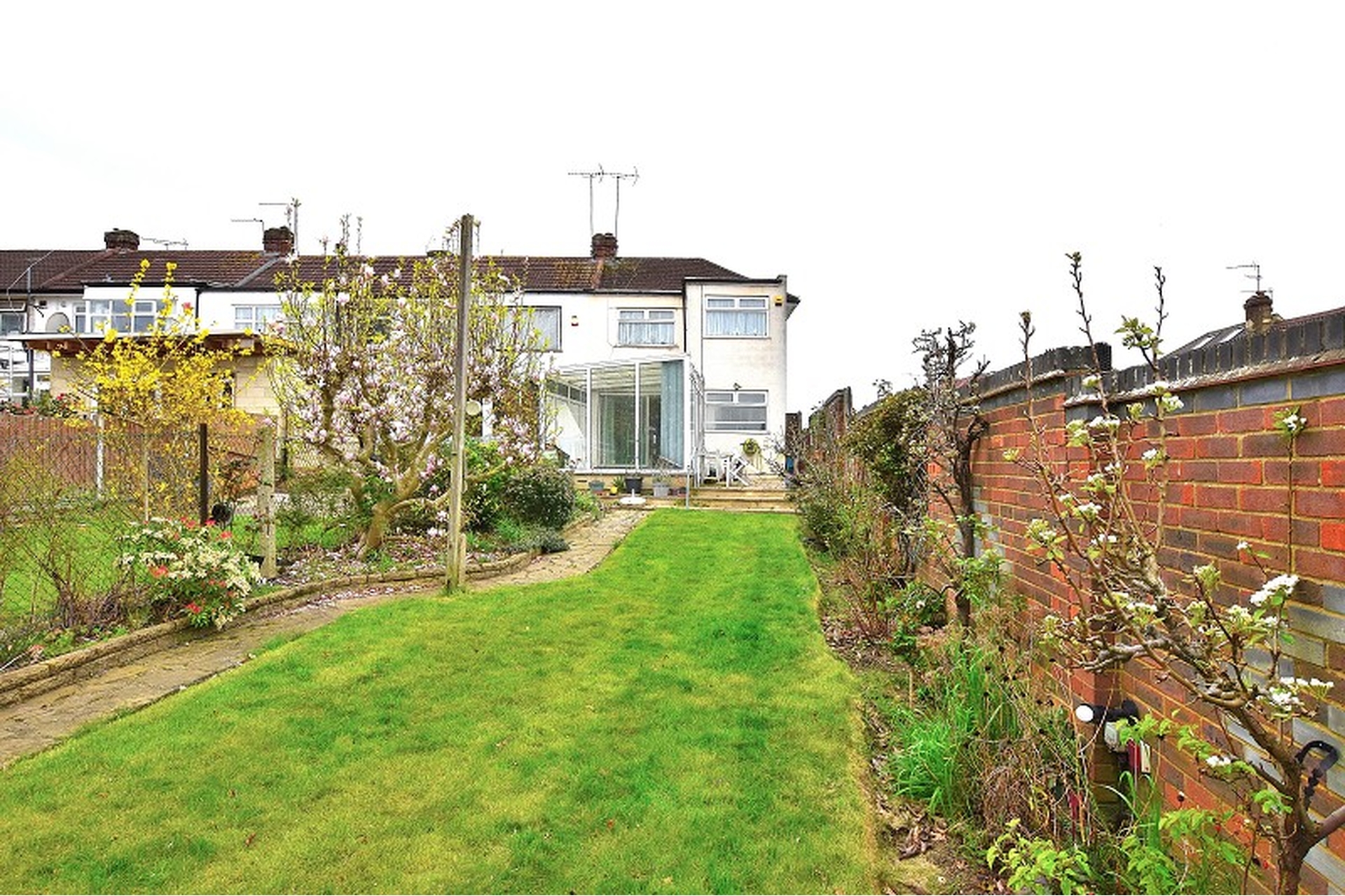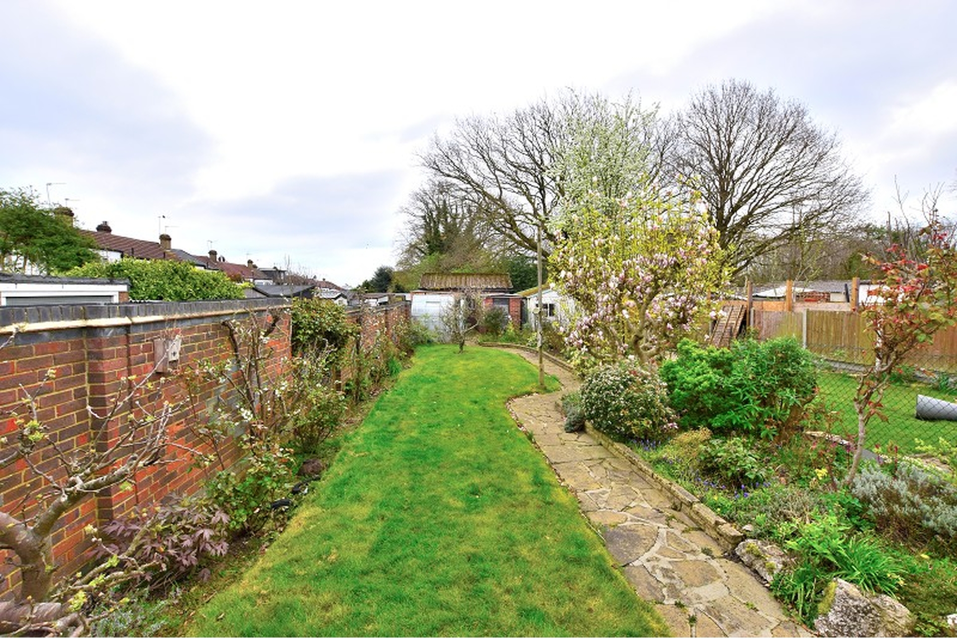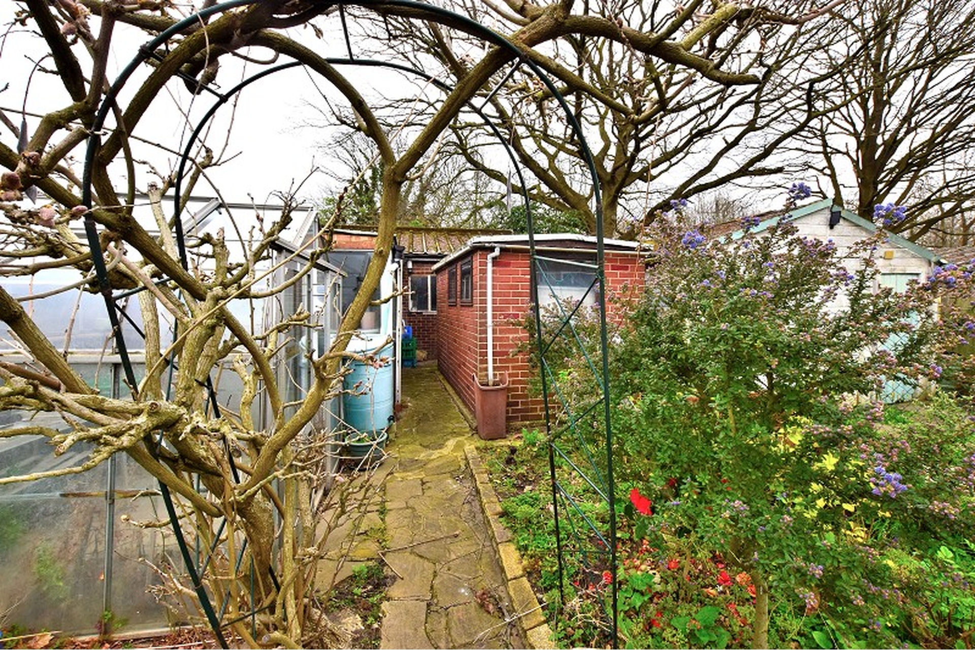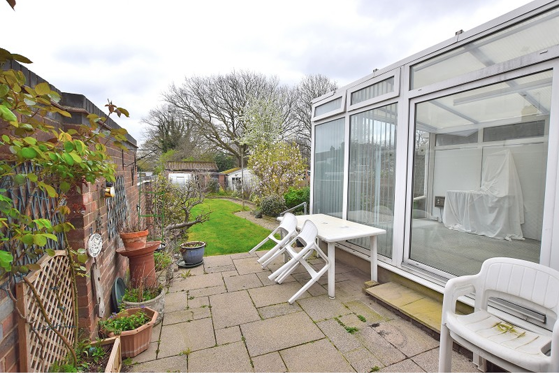 GARDEN: Partly paved patio, lawn area and boarders with mature trees and shrubs, brick shed and rear double garage, access via service road (gated and locked)