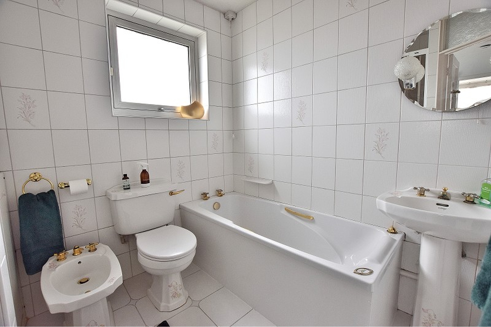 BATHROOM: Ceramic flooring, panelled bath with closed coupled toilet and bidet, pedestal basin, fully tiled walls, obscure double glazed window to side aspect, radiator, shower cubicle with thermostatic shower, built in cupboard.